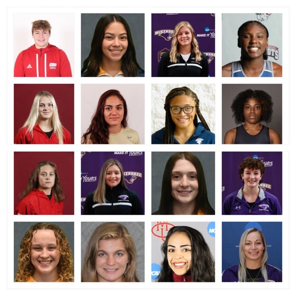 From top (L to R, row by row): Row 1: Ashley Reed, Jasmine Godinez, Alara Boyd, Chamira Cooper, Row 2: Mateah Roehl, Sugey Ceja, Tiyahna Askew, Naomi Henry, Row 3: Sara Sulejmani, Cameron Guerin, Mea Mohler, Joye Levendusky, Row 4: Lexi Basham, Zoe Nowicki, Marissa Gallegos, Brooke Thurber. Photos courtesy of Sacred Heart Athletics, Texas Wesleyan Athletics, McKendree Athletics, Cumberlands Athletics, North Central Athletics, New Jersey City Athletics, Adrian Athletics, Colorado Mesa Athletics, UWSP Athletics.